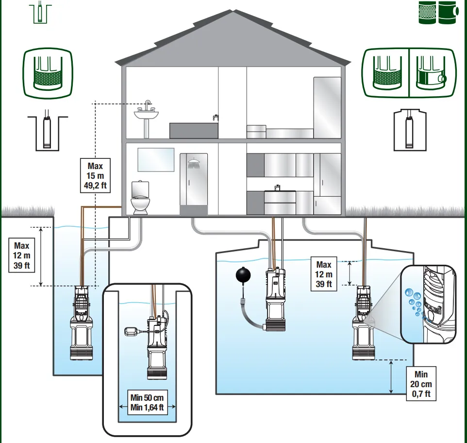 • Geräuscharmer Betrieb unter Wasser, ideal für hausnahe Zisterneninstallationen.