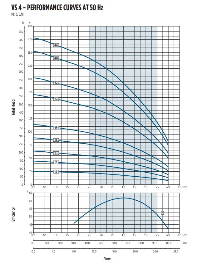 - Maximale Förderhöhe innerhalb der VS 4-Serie zur Erschließung tiefster Wasservorkommen bei konstantem Durchfluss.