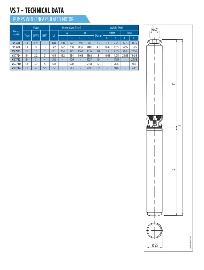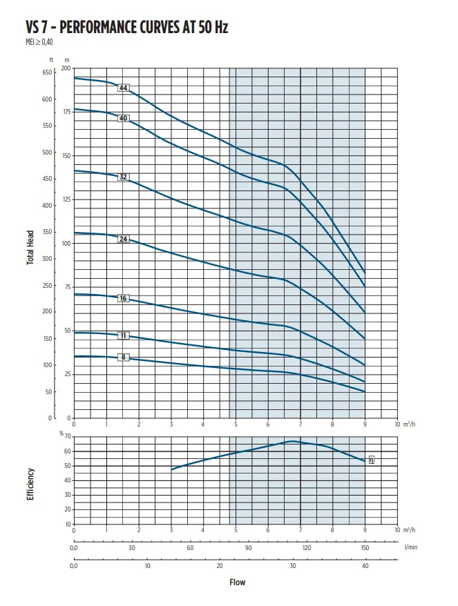 - Maximale Förderhöhe der VS 7-Serie zur Erschließung tiefster Wasservorkommen bei 7 m³/h Nennförderstrom.