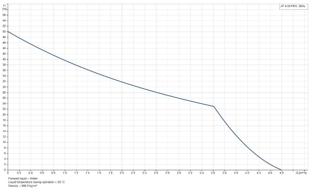 Die Grundfos JP 4-54 PM1 verfügt über einen eingebauten Thermoschutz und kann Wasser bis zu einer Tiefe von 8 Metern ansaugen. Die Pumpe hat eine maximale Pumpkapazität von 4.800 Litern pro Stunde und eine maximale Förderhöhe von 50 Metern (5,0 bar). Die Grundfos JP 4-54 PM1 ist eine 230V Pumpe mit einer Leistung von 0,75 kW und wird standardmäßig mit Anschlusskabel/Stromkabel geliefert.