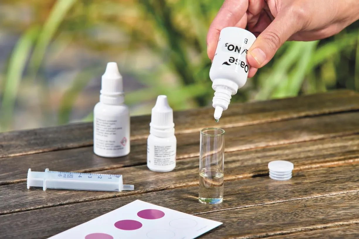 Entnehmen Sie eine Wasserprobe aus ca. 20 cm Tiefe. Füllen Sie die Messküvetten bis zur Markierung und geben Sie die entsprechende Reagenzmenge hinzu. Vergleichen Sie die Farbreaktion nach der vorgeschriebenen Wartezeit mit der Farbskala oder zählen Sie die Tropfen bis zum Farbumschlag bei Härtetests.