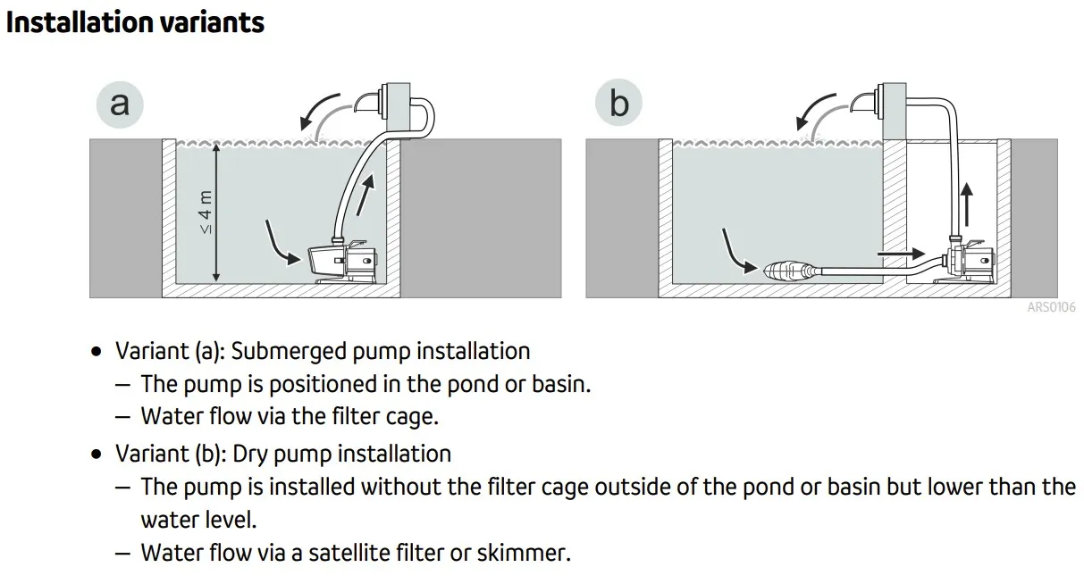 Platzieren Sie das Gerät waagerecht am tiefsten Punkt des Teichs. Führen Sie die Verrohrung zum Wasserspiel und sichern Sie die Verbindungen mit Edelstahlschellen. Die Pumpe ist für den 24/7-Einsatz technisch konzipiert; achten Sie auf eine ausreichende Wassertiefe zur Vermeidung von Luftansaugung.