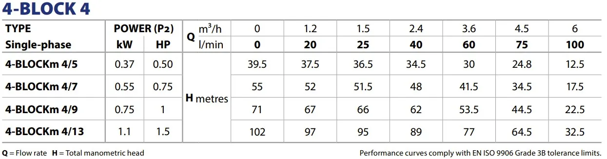 Die Pedrollo 4BLOCKm 4/13 ist eine anschlussfertige 4-Zoll-Monoblock-Unterwasserpumpe zur Förderung von sauberem Wasser mit Sandanteilen bis zu 150 g/m³. Sie löst Installationsschwierigkeiten in engen Brunnen durch den integrierten Kondensator und den eingebauten thermischen Motorschutz. Die technische Ausführung mit schwimmenden Laufrädern garantiert höchste Verschleißfestigkeit und Betriebssicherheit gemäß ISO 9906.