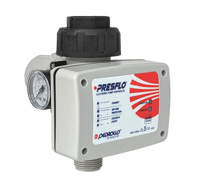 Der Pedrollo Presflo PF1215 ist ein elektronisches Schaltgerät zur automatischen Steuerung von Einphasenpumpen bis 1,5 kW. Er löst das Problem unkontrollierter Pumpenstarts durch eine strömungsbasierte Logik, die die Pumpe beim Öffnen eines Verbrauchers aktiviert und beim Schließen sicher abschaltet. Das integrierte Manometer ermöglicht eine direkte Druckkontrolle und gewährleistet eine hohe Wartungsarmut durch Verzicht auf große Druckbehälter.