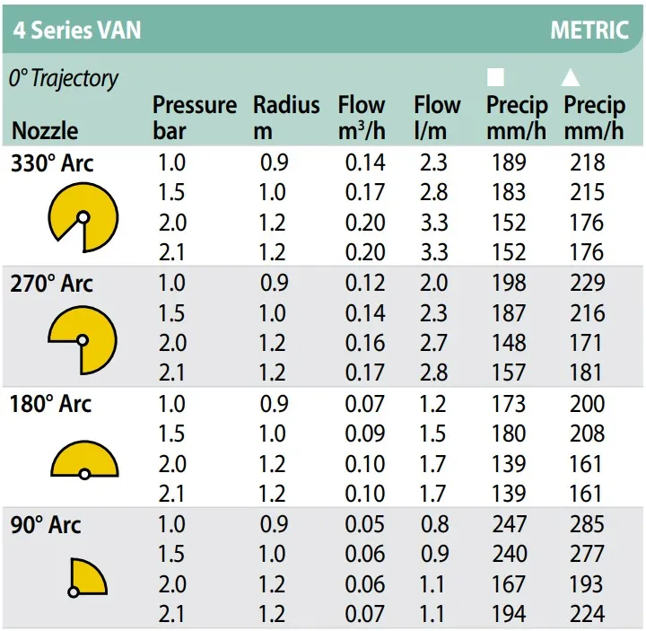 Besonders geeignet für sehr schmale Beete, Eckbereiche oder Pflanzgefäße. Die Installation erfolgt durch Aufschrauben auf ein Rain Bird 1800-Gehäuse. Zur Montage ist kein Spezialwerkzeug erforderlich; die Sektorenjustierung erfolgt manuell am Düsenkopf. Achten Sie bei der Installation darauf, dass der Systemdruck im Bereich von 1,0 bis 2,1 bar liegt, um das optimale Sprühbild der VAN-4 zu erhalten. Ein Filter zur Vermeidung von Düsenverstopfungen liegt jeder Düse bei.