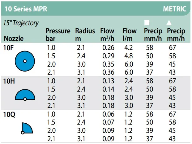 Die Rain Bird MPR-10H Düse in Blau bietet eine exakte 180°-Bewässerung für Flächen mit einem Radius von 3,0 Metern. Dank der Matched Precipitation Rate (MPR) Technologie ist sie perfekt für Systeme geeignet, in denen verschiedene Sektoren gleichzeitig bewässert werden. Die blaue Farbe kennzeichnet zuverlässig die 10-Fuß-Serie von Rain Bird für eine einfache Handhabung.