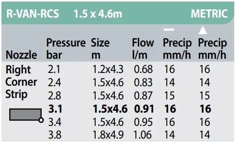 Die Rain Bird R-VAN-RCS ist die dunkelgraue Rotationsdüse für die präzise Bewässerung von rechten Ecken (Right Corner Strip). Sie liefert ein rechteckiges Sprühbild von 1,5 x 4,6 Metern und nutzt rotierende Multistrahlen für eine homogene Wasserverteilung. Als Teil der hocheffizienten R-VAN Familie schont sie Ressourcen, indem sie Sprühnebel minimiert und das Wasser auch bei leichtem Wind zielgenau zum Wurzelbereich der Pflanzen führt.