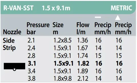 Die Rain Bird R-VAN-SST ist eine schwarze Rotationsdüse für Mittelstreifen (Side Strip) mit einem beeindruckenden rechteckigen Sprühbild von 1,5 x 9,1 Metern. Sie ist die hocheffiziente Antwort auf die Bewässerung langer, schmaler Korridore. Durch die Rotationstechnologie wird eine überlegene Verteilungsgleichmäßigkeit erreicht, die herkömmliche Streifendüsen weit übertrifft und gleichzeitig Wasserverluste durch Verdunstung und Wind reduziert.