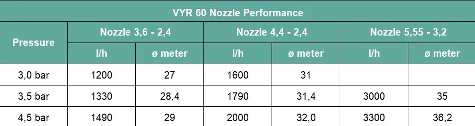 Ideal für große Gärten, Baumschulen und Gemüsebeete. Die Montage erfolgt auf Standrohren oder mobilen Regnerwagen. Achten Sie auf eine feste Verankerung des Standrohrs, da die Schwinghebelbewegung Vibrationen erzeugt. Zur Sektoreneinstellung werden die Anschlagklammern einfach auf den gewünschten Winkel gedreht. Der VYR 60 ist unempfindlich gegenüber Sand und Schmutz im Wasser.